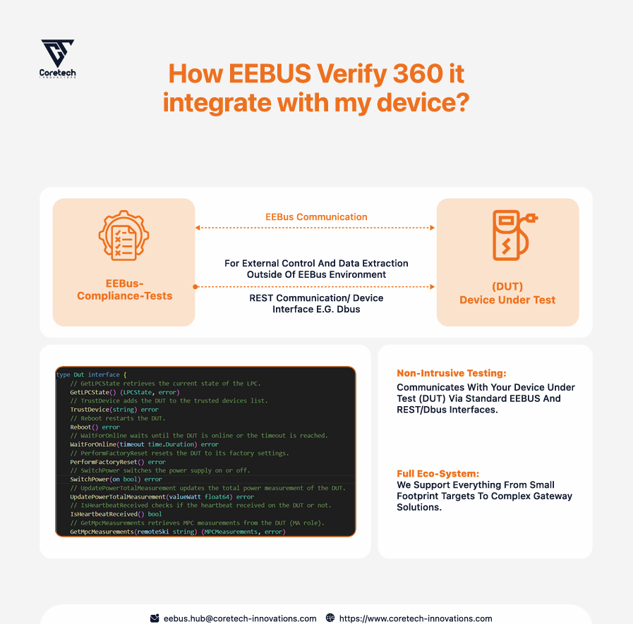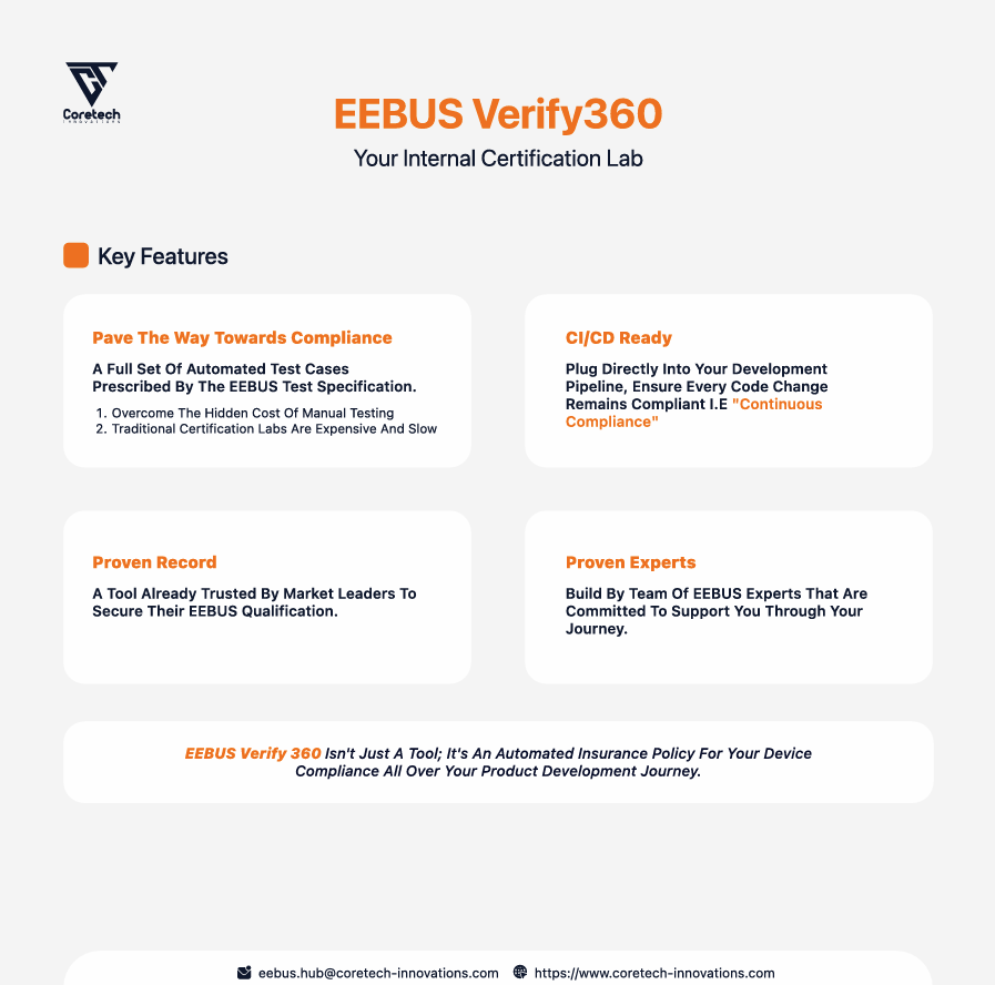 EEBUS Verify 360 turns the EEBUS Test Specification into a practical validation solution that manufacturers can use during development to prepare devices for qualification readiness.
