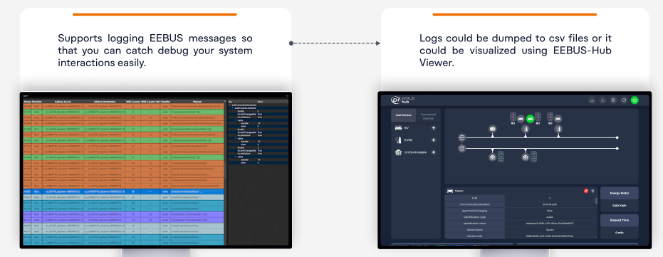Logs could be dumped to csv files or it could be visualized using EEBUS-Hub Viewer.